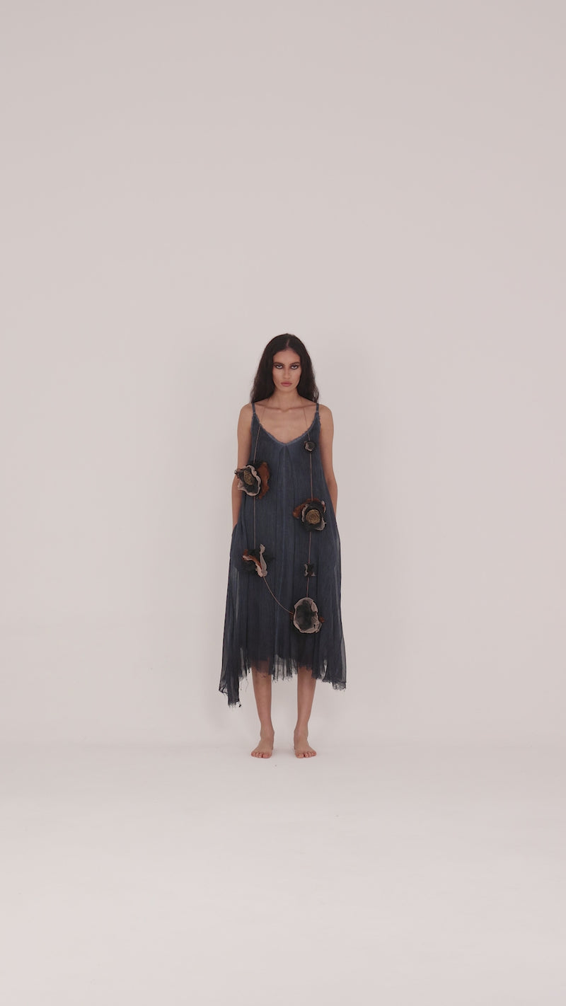 S194 Ash Grey Pigment Dyed Overlayed Dress with cotton strapping, raw edges, central box pleats create fullness to curved hemlines.