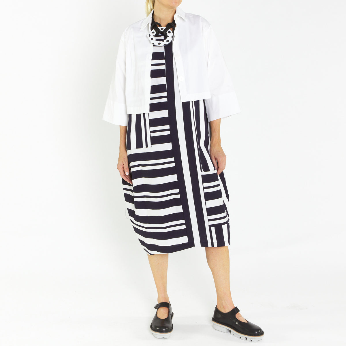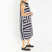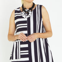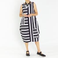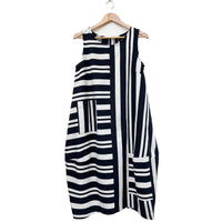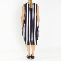 Bop Navy Silver Butcher Stripe A line Sleeveless Dress with round neckline.