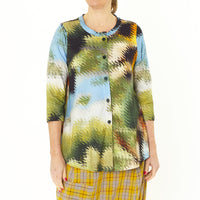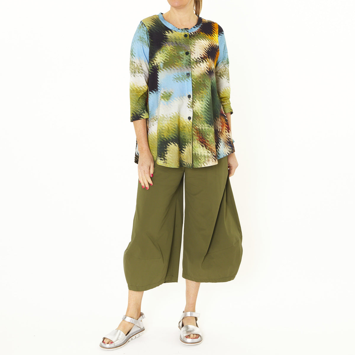 Casey Rococco Swing Cardigan with button through front, 3/4 sleeves, khaki stripe rear panels, with curved & stepped hemlines.