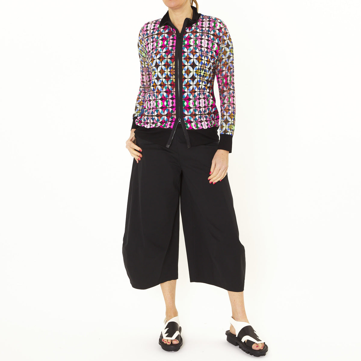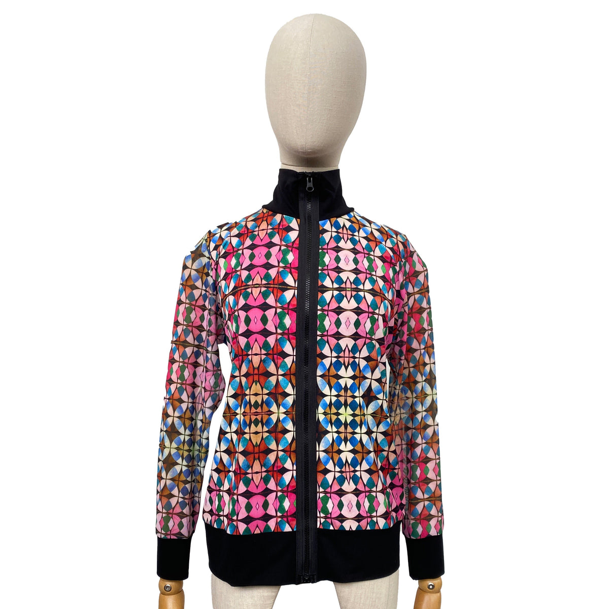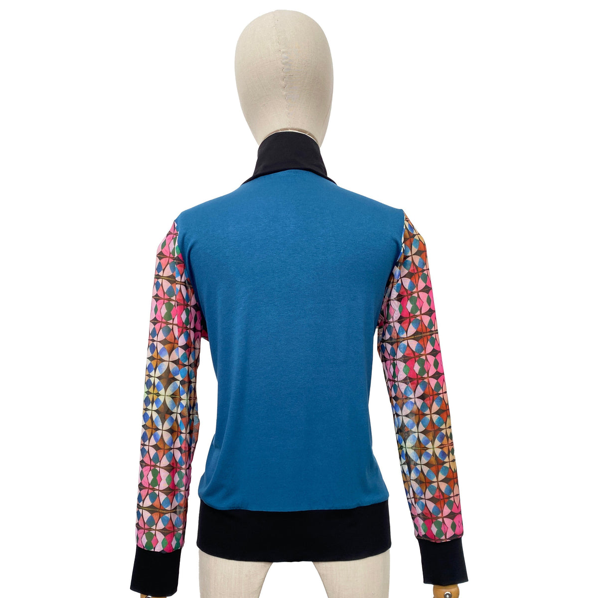 Collide Zipper Jacket with teal contrast back, black neck collar, cuffs and hems, with collide net sleeves. Features a two way moulded black zip.