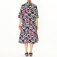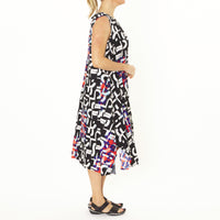 Cut Curve printed cotton poplin sleeveless Dress with scoop neckline, and generous long trapeze swing to curved bound hemlines, with hidden side pockets.